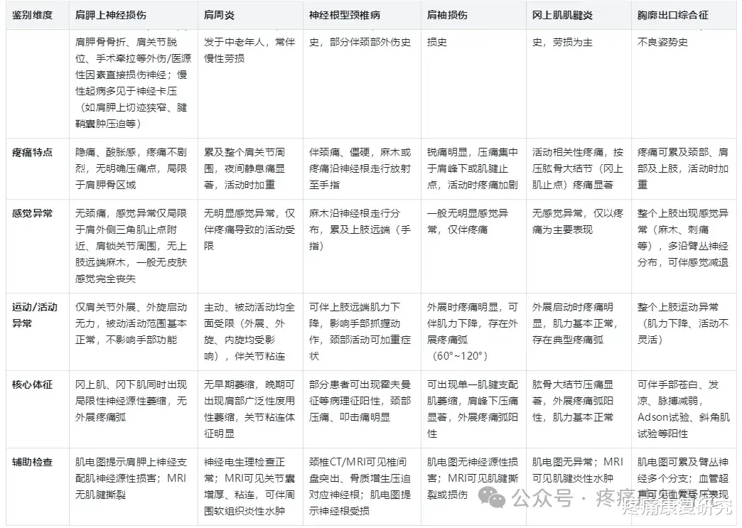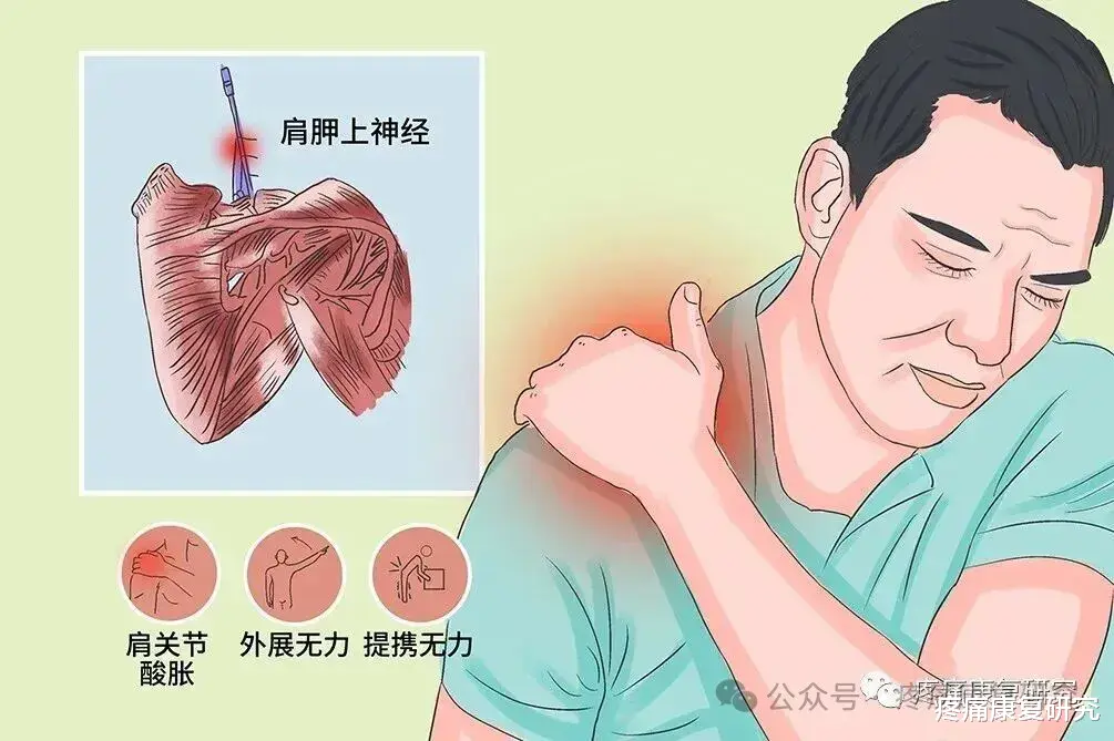 肩胛上神经的感觉纤维与肱骨后方皮肤感觉纤维同属相同神经节段,且均以支配深部感觉为主要功能。因此,患者常诉肩周深部钝痛,疼痛部位模糊不清,难以精准定位,这也是该神经相关损伤的典型早期表现之一。