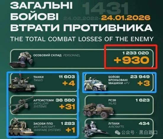俄乌战争第1431天(2026年1月24日),过去24小时大事件概述如下: