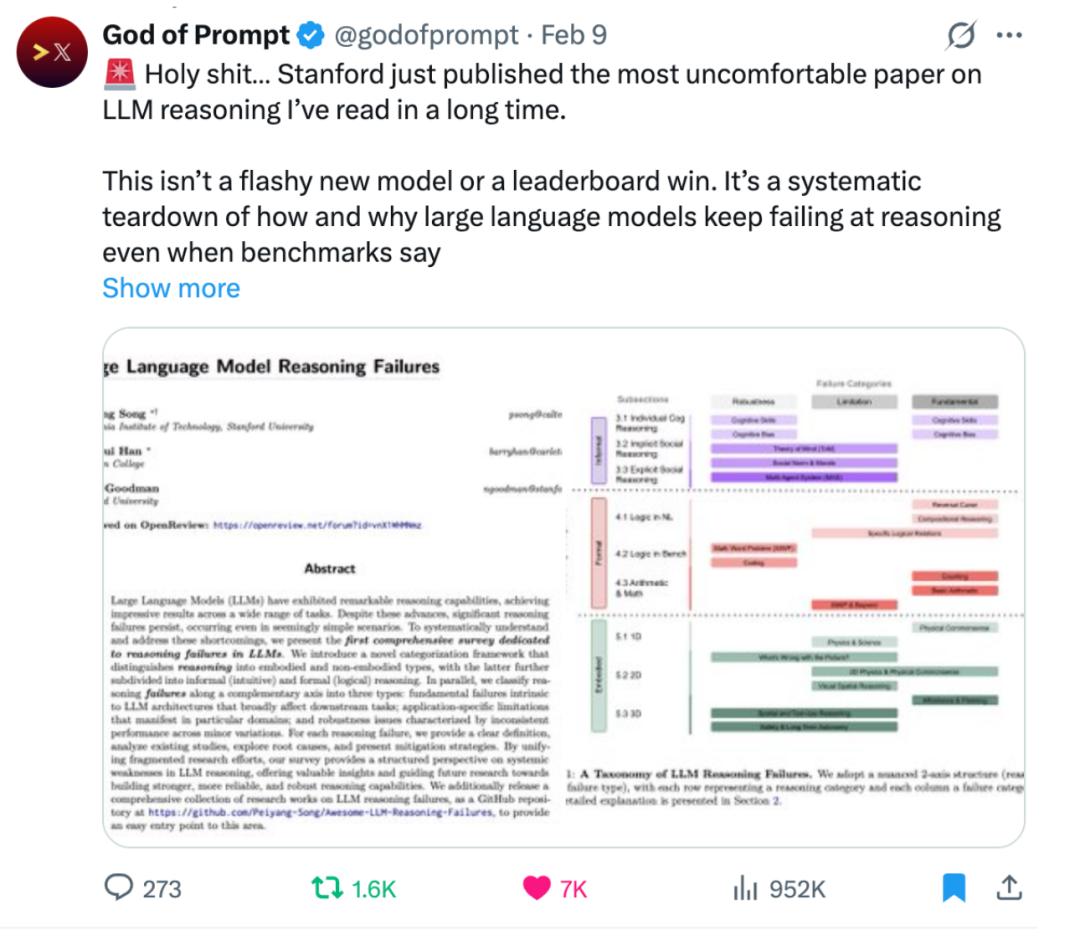 在 X(原 Twitter)上,有评论直言这是“近年来最令人不安的一篇 LLM 推理论文”。所谓“不安”,并非因为提出了夸张的结论,而恰恰相反——它并未展示新的 SOTA 模型,也未公布新的 leaderboard 成绩,而是系统梳理了大语言模型在推理方面反复出现的失败模式。