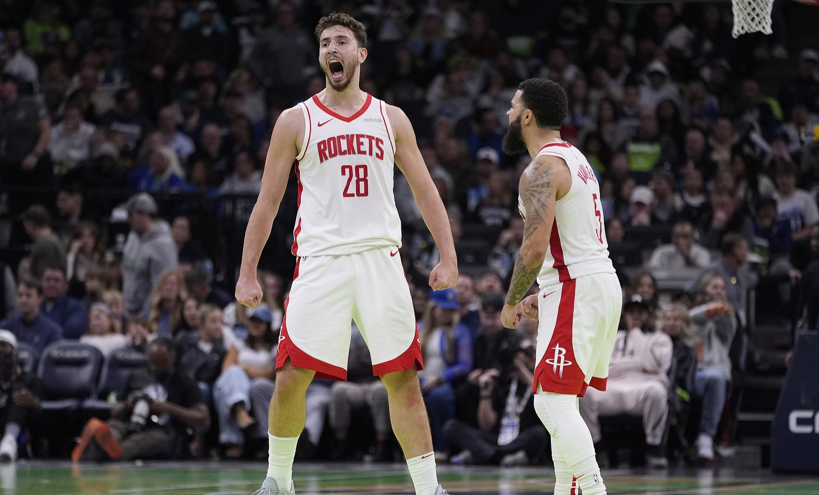 但是,自从火箭选中小贾巴里史密斯后,史密斯+申京的四五号位阵容,基本成为火箭的常规组合,史密斯相较较好的体型,协防意识,以及防守轮转,能为申京在防守端擦屁股,在进攻端,史密斯高炮台属性,能为申京拉开空间,两人的搭档,能刚好弥补申京短板,是申京最适配内线的锋线球员。