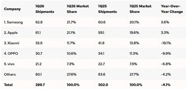 比如苹果、三星、小米、OPPO之所以排在前面,主要还是因为海外市场占比高,所以哪怕在中国市场占比不那么高,也能够表现不错。