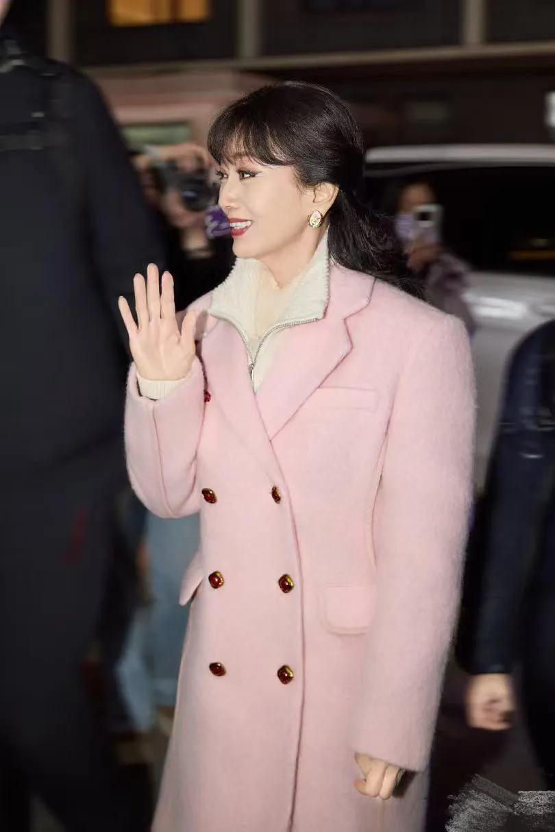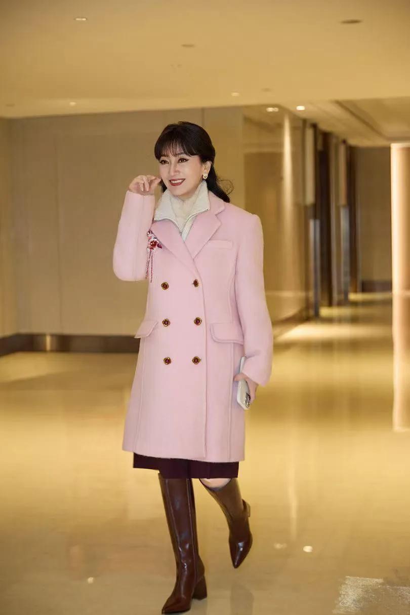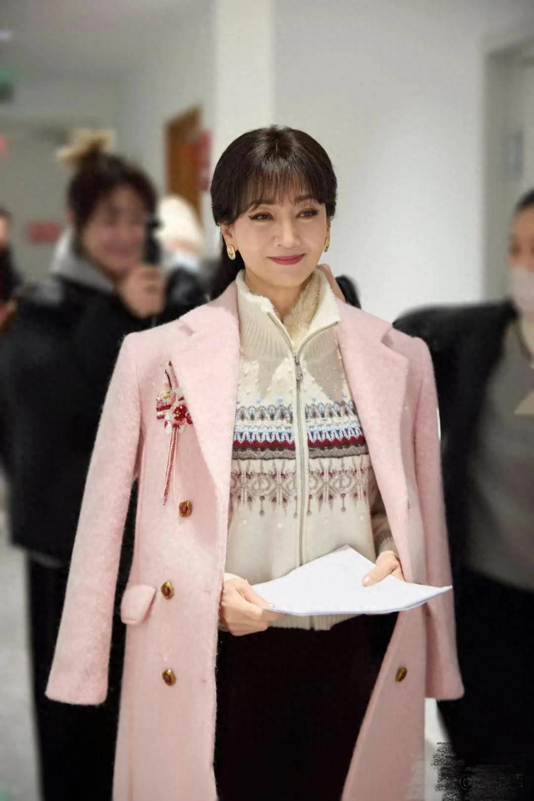 被赵雅芝的老年穿搭惊艳了!粉大衣提花毛衣半裙,时髦减龄高级!
