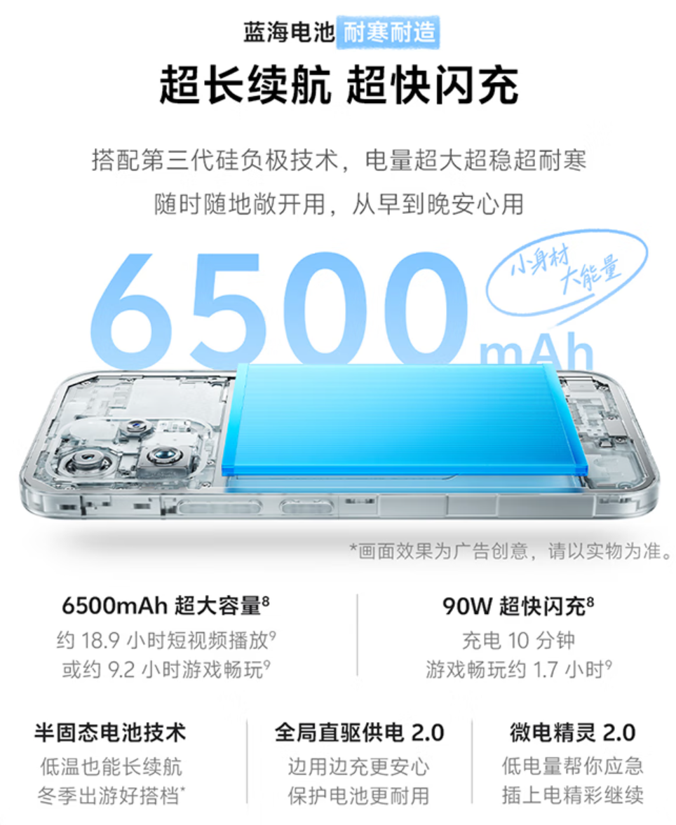 - 如果你是重度手机用户,6500mAh的超大电池和90W闪充能给你满满的安全感。