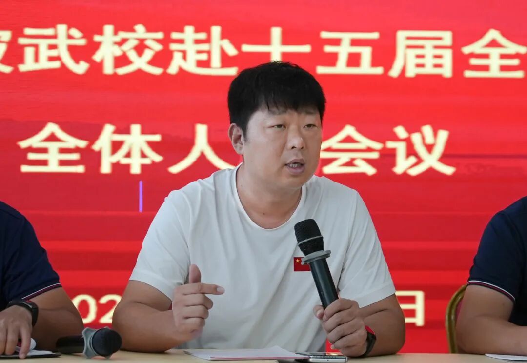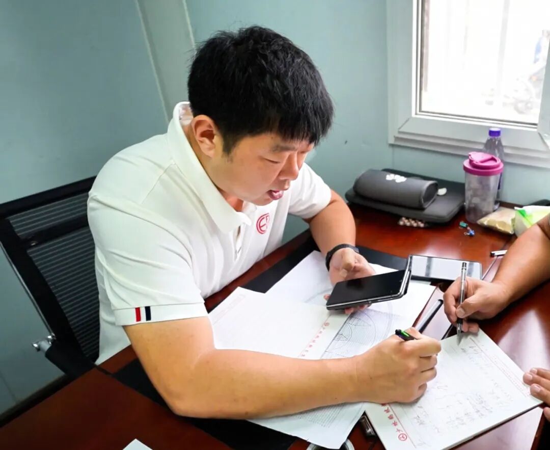 深夜,他召集教练团队逐字逐句讲解排练图纸,对着阵型图标注鼓队的站位、棍术的衔接点、旗阵的变换节奏,甚至细化到拉鳌鱼同学的穿梭路线,确保每个元素配合到位;排练时,他穿梭在学生队伍里,亲自示范、纠正动作,衣服湿了几遍也浑然不觉;9月集训,他带着团队扎进广州的封闭基地,深夜他反复回看排练视频,记下每一个需要优化的地方;训练场上,他始终站在队伍最前面,拿着扩音喇叭喊动作、抠细节,为了让“喜洋洋”“乐融融” 更灵动,他陪着学生反复琢磨动作,经常凌晨还在修改动作方案。