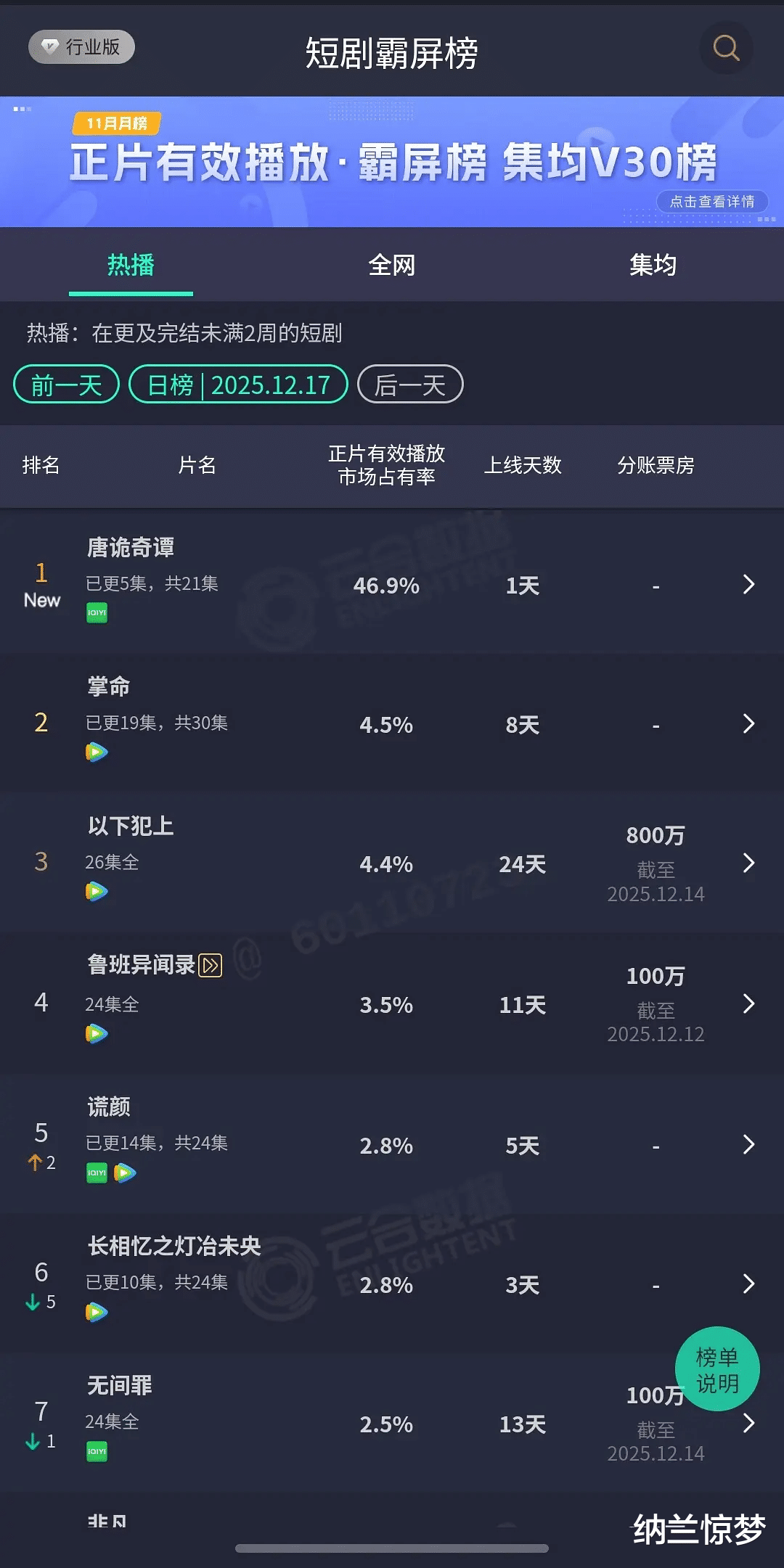《唐诡奇谭》在横屏短剧赛道可谓杀疯了,根据第三方数据显示,《唐诡奇谭》的正片有效播放市场占有率接近整个大盘的50%,要知道排名第二的市占率不过才4%左右。凭借成熟的强IP基础,杨旭文杨志刚等原班人马回归带来的亲切感,《唐诡奇谭》在横屏短剧赛道就是降维打击的存在。