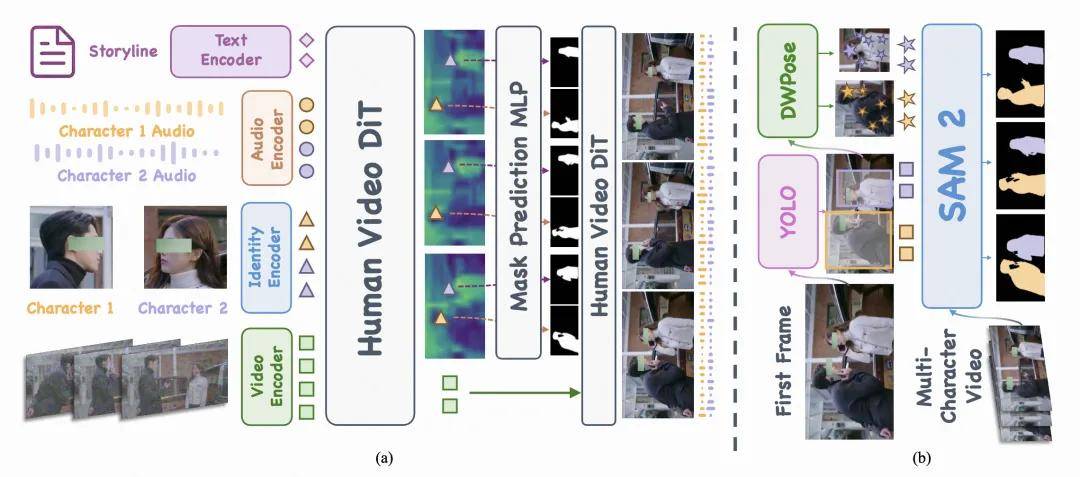 (a) KlingAvatar2.0 基于 DiT 深层 block 特征预测指定角色在视频中每一帧画面的位置,控制音频精确驱动该位置的角色。(b) 可灵团队基于 Yolo、DWPose、SAM2 等模型构造了数十万条高质量多人数据用于训练。