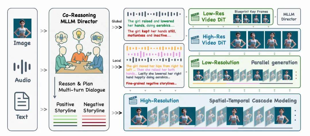 KlingAvatar2.0 的共推理导演系统就像是给数字人配备了一个专业的导演团队。这个系统由三位 "AI 专家" 组成,它们会像真正的电影制作团队一样密切协作: