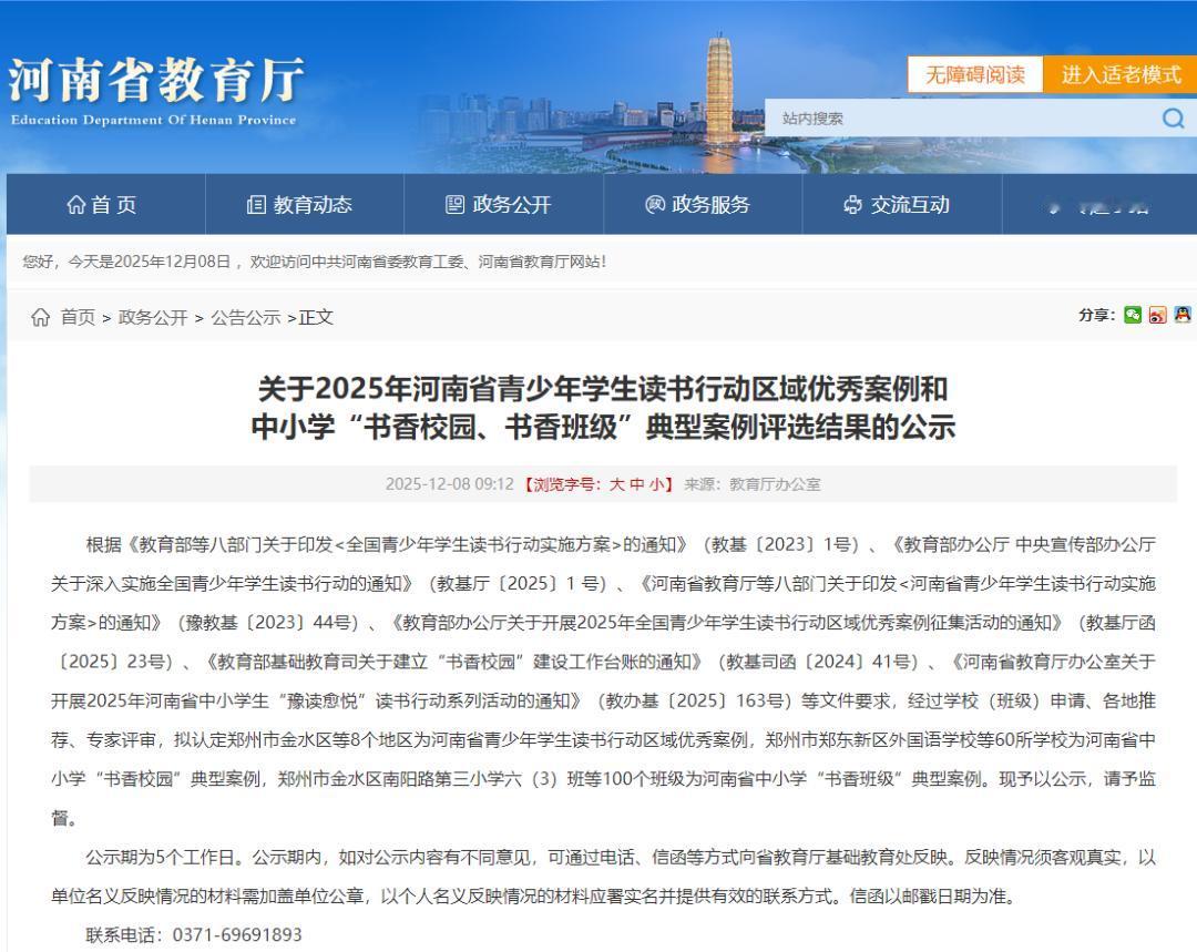 12月8日,河南省教育厅 发布公示, 根据相关文件要求,经过学校(班级)申请、各地推荐、专家评审,拟认定郑州市郑东新区外国语学校等60所学校为河南省中小学“书香校园”典型案例,郑州市金水区南阳路第三小学六(3)班等100个班级为河南省中小学“书香班级”典型案例。其中,我市2所学校、3个班级入选名单。