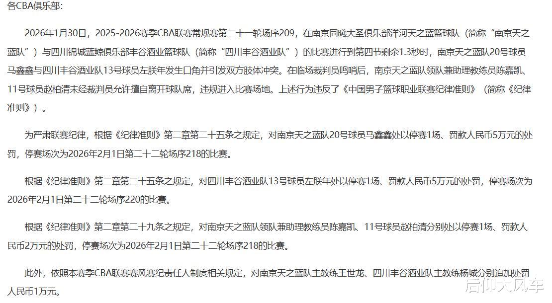 时隔1天后,北京时间2月1日,CBA联赛针对这次冲突,开出了本赛季至今为止最大的一张罚单,CBA公司以“马鑫鑫与左朕年发生口角并引发双方肢体冲突,在临场裁判员鸣哨后,助教陈嘉凯、赵柏清未经裁判员允许擅自离开球队席,违规进入比赛场地”为由,分别对左朕年、马鑫鑫、赵柏清以及同曦助教陈嘉凯处以重磅处罚。