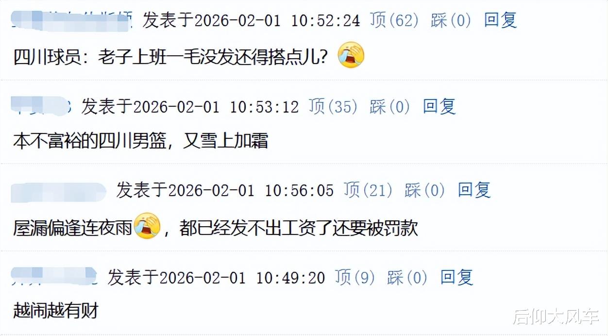 对于这张罚单,评论区球迷则是非常不理解,一部分球迷为四川队叫屈:本不富裕的四川男篮,又雪上加霜;屋漏偏逢连夜雨,都已经发不出工资了还要被罚款,至于吗?还有球迷替左朕年喊冤:打了一年球,讨薪违法,还欠5w!这下好了,上个班不但不挣钱,还得搭点。