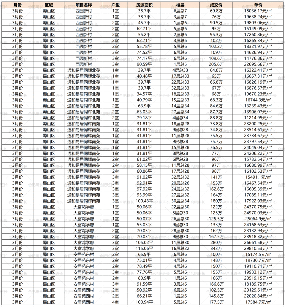 以上就是2026年3月部分区域的一些学区房成交情况,庐阳区和蜀山区的学区房在其中价格和销量都排名前列,滨湖区双本部也成交量可观,可见如今学区房市场同样分化明显。