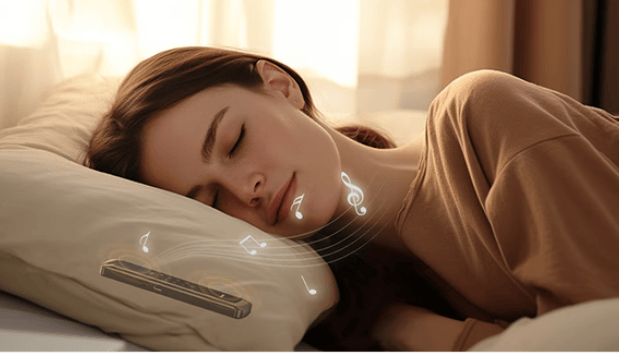 它不是普通音箱,而是放在枕头下面,用骨传导把声音贴着枕头送到耳边,不用戴耳机,侧睡、翻身都不硌。塞在枕头下几乎没存在感,躺下就像多了一层“睡眠氛围”。私密性也做得很好,声音基本锁在枕头范围里。你听雨声、白噪音、有声小说,旁边的人不会被影响,合租、情侣、室友用起来都很舒服。