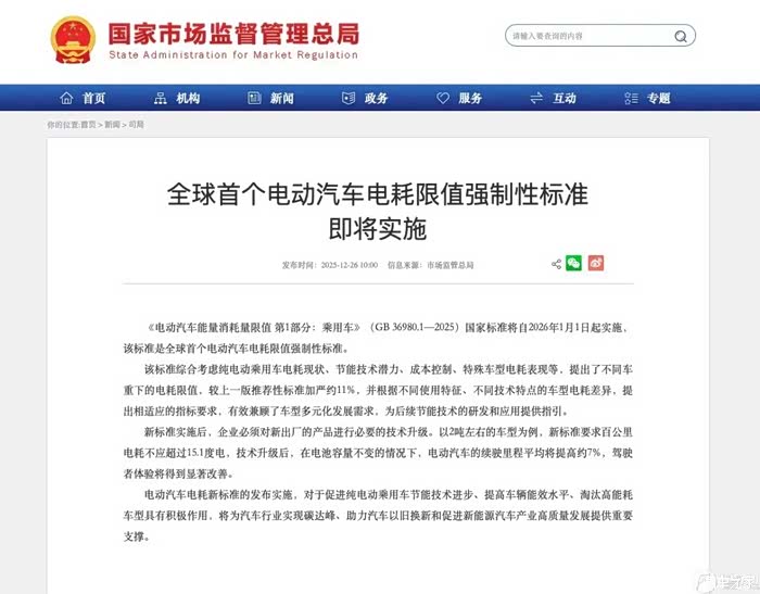 国家市场监督管理总局发布消息,全球首个针对电动汽车电耗的强制性限值标准——《电动汽车能量消耗量限值 第1部分:乘用车》(GB 36980.1—2025),将于2026年1月1日起正式实施。此项新规旨在为纯电动乘用车的能耗设立明确的准入红线。标准的核心是根据车辆重量设定差异化的百公里电耗上限值,整体要求较此前执行的推荐性标准加严了约11%。以市面上常见的约2吨重的车型为例,新标准要求其百公里电耗不应超过15.1度电。