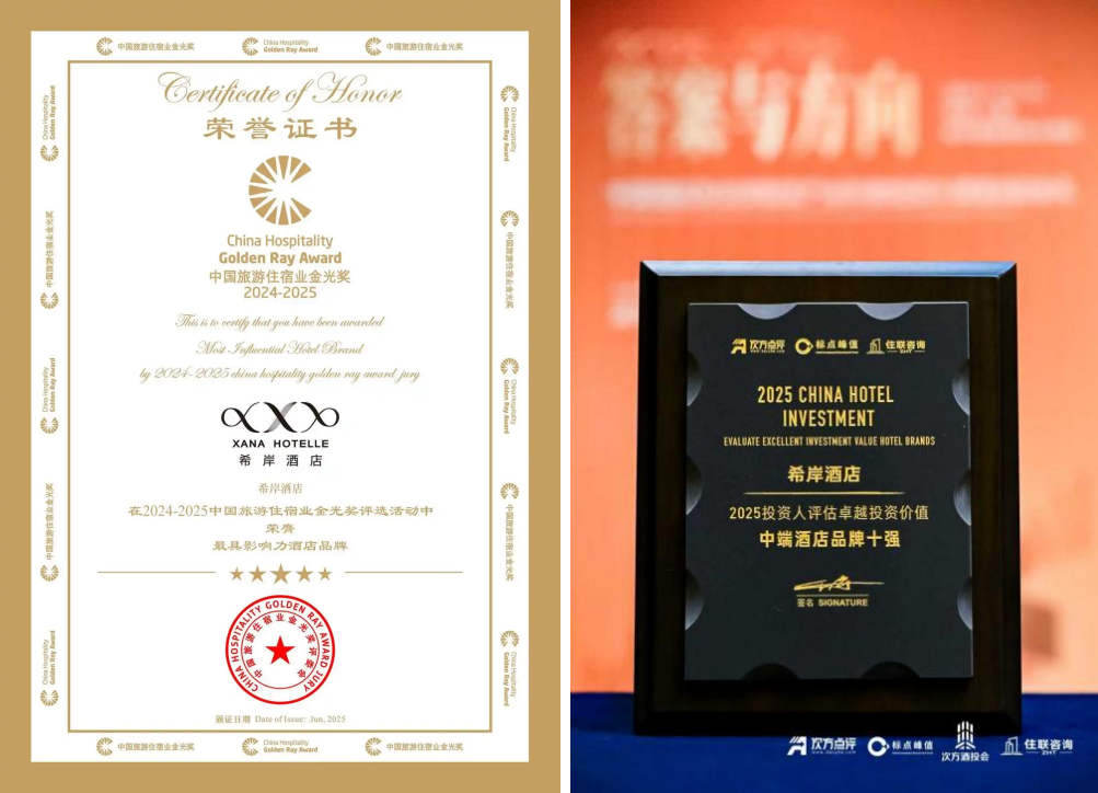 十年深耕与2025年的扎实成长,为希岸赢得了行业内外的一致赞誉。年内,希岸接连荣获“酒店高参·2025酒店品牌榜”年度推荐中端酒店与“2024-2025中国旅游住宿业金光奖最具影响力酒店品牌”等国内权威奖项,体现了行业对其市场地位与品牌影响力的高度肯定。