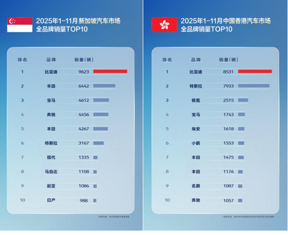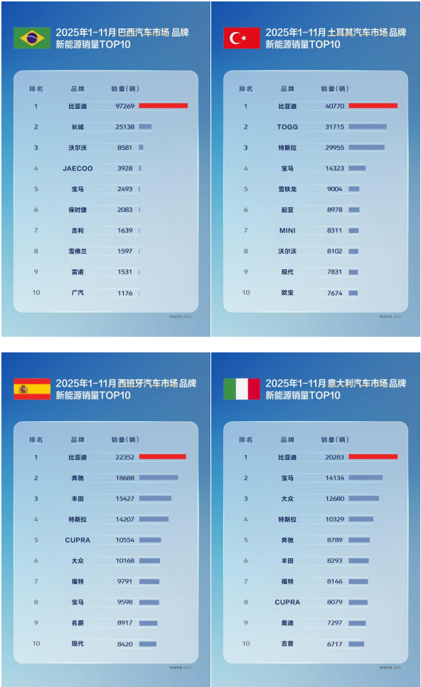 11月,比亚迪在巴西、土耳其、意大利、西班牙、匈牙利、克罗地亚等国拿下了新能源汽车销量第一,在新加坡等国家获得全品牌销冠。多国销冠全面超越,1-11月累计表现同样不俗,在巴西、土耳其、西班牙、意大利等国,比亚迪位列新能源汽车品牌销量榜首;在新加坡、中国香港等地区市场荣膺全品牌销量第一,备受消费者认可。