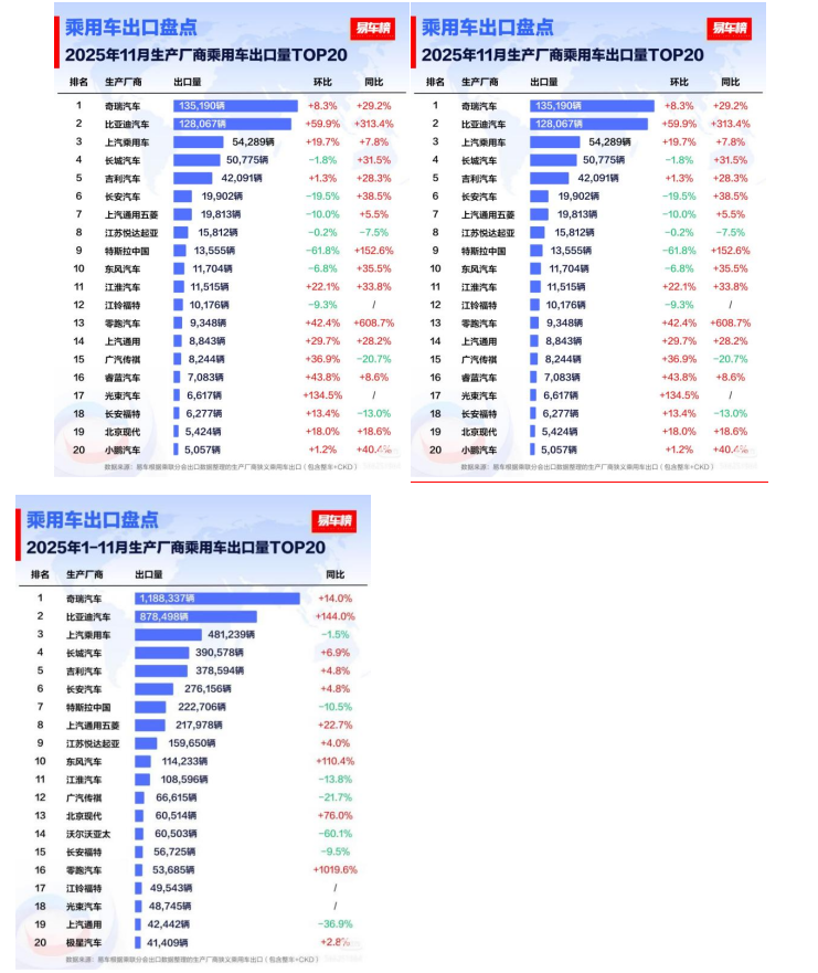 据易车数据显示,2025年11月,比亚迪乘用车出口量达到12.8万台,同比增长313.4%;今年1-11月累计出口87.8万台,同比增长144%,较2024全年总出口量已实现翻倍式增长,比亚迪成为中国出口增速最快的车企之一。