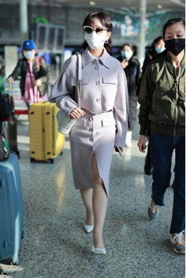 半身裙在色调与材质厚度上与上衣呼应,正面同样饰以一列纽扣。开衩位于裙摆正前方,高度控制在近膝位置,既修饰腿型又避免走光风险,让视觉焦点自然落在优雅的步态之间。