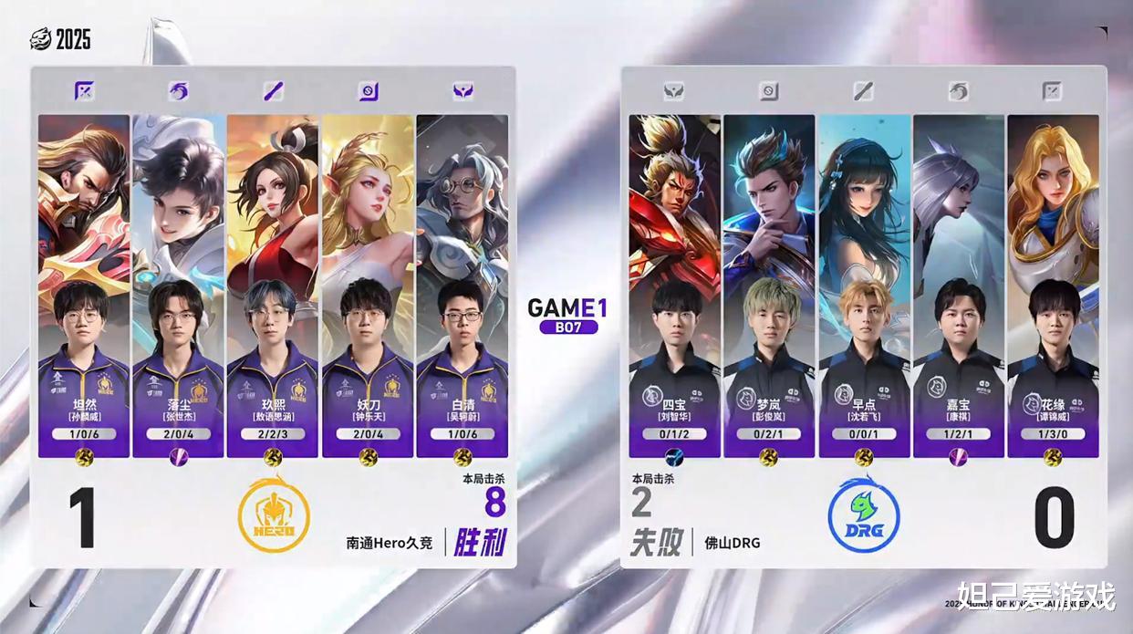 双方BO7第一局比赛,Hero拿到鲁班大师、曹操,这都是当前版本强度较高的英雄。进入对局,Hero妖刀一波关键探草找到DRG打野嘉宝,将其击杀拿到一血后,Hero开始不断利用阵容的强势打推进,而DRG这套体系打团挺猛,但防守高地的能力真心弱,仅15分半,拿到双龙的Hero就成功推掉DRG水晶。