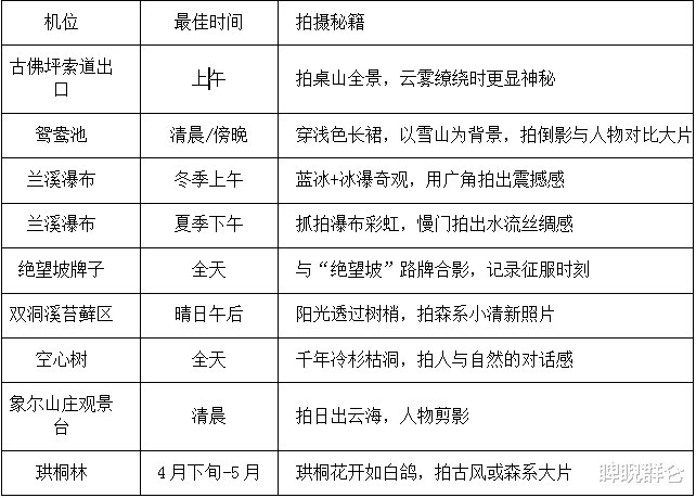 拍照机位:古佛坪索道出口,拍桌山全景,云雾缭绕时如临仙境。