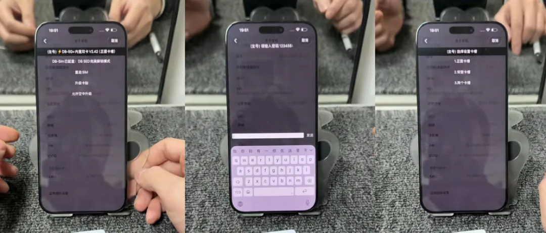 1.将升级卡放置手机主卡位置(上面位置),等待手机弹窗,弹窗之后选择第一个“DB-Sim已配置:DB SED完美解锁模式”,按照要求输入密码123456,点击发送。