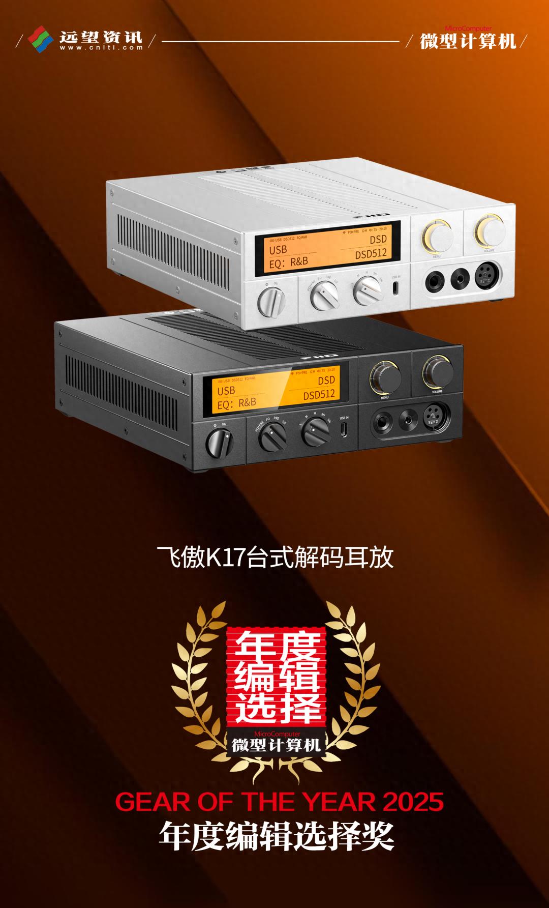 在声学技术的持续深耕与用户需求的敏锐洞察下,2025年飞傲于各条产品线均推出了一系列表现扎实、功能丰富,且在技术与设计上不乏亮点的产品。其中,K17台式解码耳放、FT13头戴耳机与M21便携音乐播放器更是凭借各自的突出特质,从众多新品中脱颖而出,分别荣获《微型计算机》2025年度评选的多项大奖。这三款产品不仅展现了飞傲在不同音频设备上的技术积累,也共同印证了其在音频领域的研发功底与市场号召力。