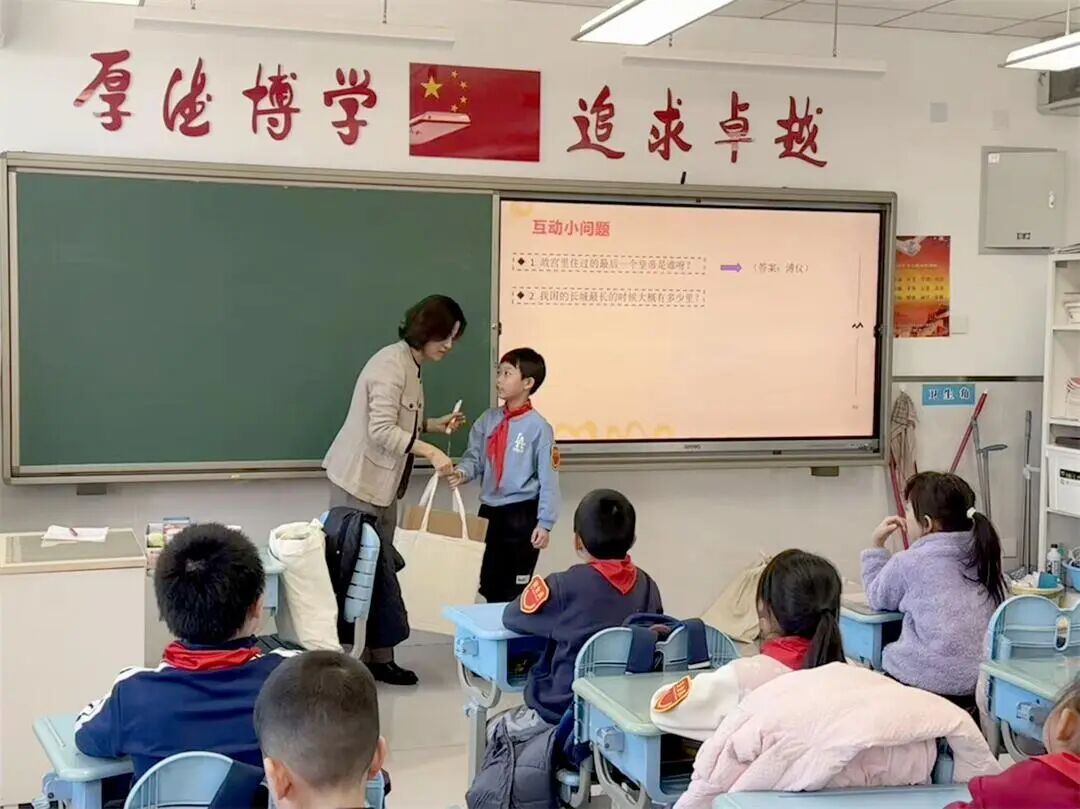 “故宫里最后一个皇帝是谁?”“长城有多长?”“兵马俑里还有什么动物俑?”……李阿姨抛出一个个小问题,孩子们争相举手,答对的同学还获得了李阿姨精心准备的小礼物,笑容绽放在每一位小朋友的脸上。