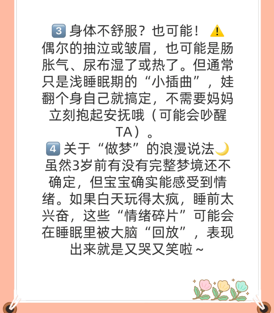回想起刚刚成为妈妈的那段日子,我几乎没睡过一个整觉。宝宝每一次翻身,每一次呼吸重一点,我都会惊醒。尤其是当她睡着睡着突然哭起来,或者发出那种奇怪的笑声,我就更加手足无措,总想着是不是做噩梦了,是不是哪里不舒服。我抱着她,轻轻拍着她的背,一遍遍地说妈妈在呢妈妈在呢。