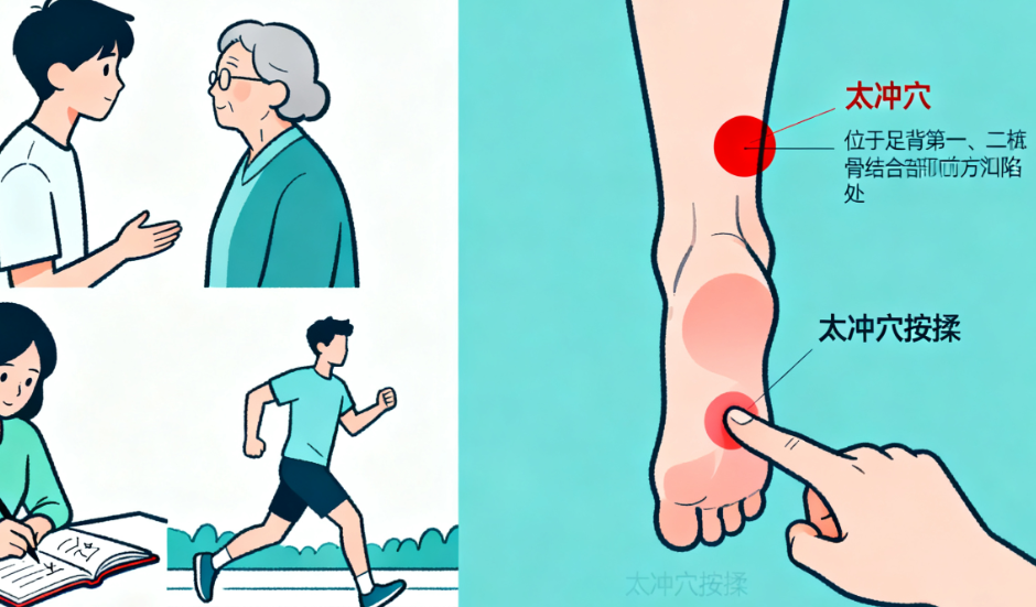 • 常按“开心穴”:太冲穴(在脚背上,大脚趾和二脚趾骨头交汇处的凹陷中)是著名的“消气穴”,经常按揉有助于疏肝理气。