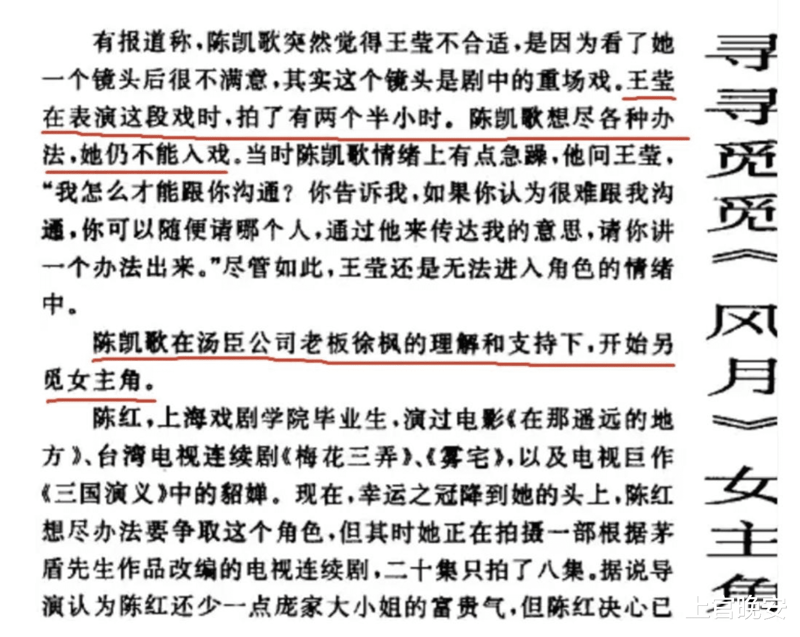 而惨遭被换角的王静莹就惨了,要知道当时的《风月》从筹备到选角到开拍都声势浩大,被导演退货不就相当于宣告这个人的演技差,陈凯歌没有直白说,只是说“如意”(影片女主角)在排斥、在抗争、在呼唤……但懂的都懂。