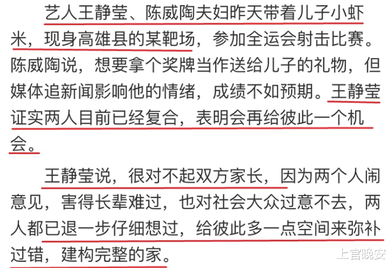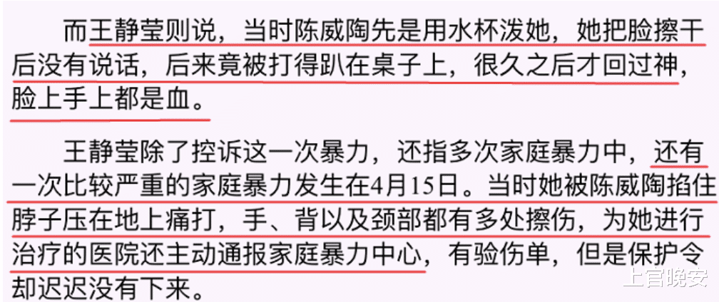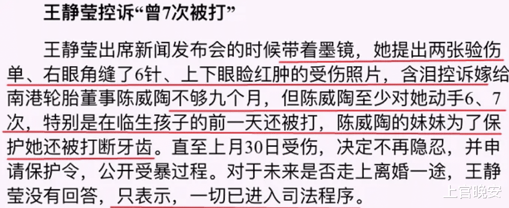 才结婚9个月王静莹就召开记者招待会,拿着验伤报告声泪俱下地控诉陈威陶家暴,结婚9个月她就被打了7次,生产前的一天还在被打,小姑子为了保护她被陈威陶打掉了一颗牙齿。