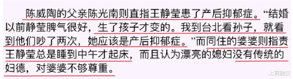 王静莹的公公婆婆也加入这场舆论战,当然是毫不意外地站自己的儿子。一个说王静莹有产后抑郁,生完孩子脾气变坏;一个说王静莹没有传统妇德,对婆婆不够尊重。