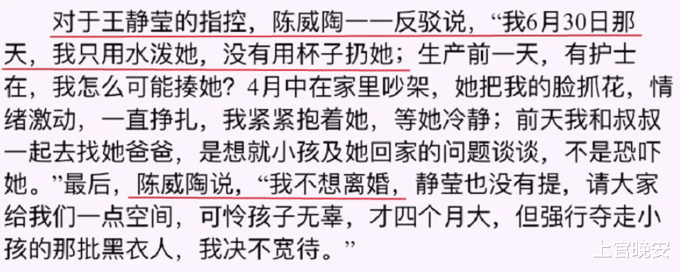 面对这些指控,陈威陶也马上开了发布会,否认家暴,说自己不想离婚,喊话王静莹快回家。