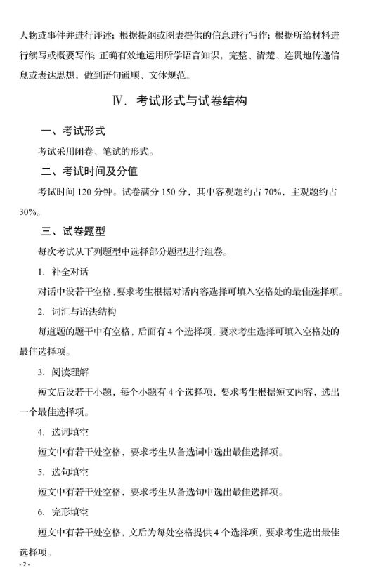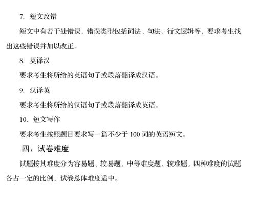 考试题型: 补全对话、词汇与语法结构(单选题)、阅读理解、选词填空、选句填空、完形填空、短文改错、英译汉、汉译英、短文写作(不少于100词)。