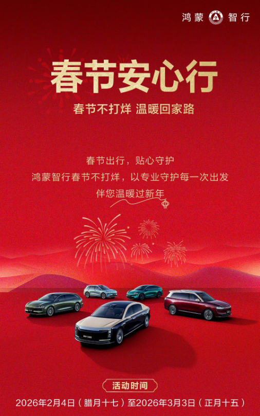 2026年2月3日消息,鸿蒙智行官宣推出“春节安心行”活动,践行“春节不打烊”服务承诺,为车主提供全方位新春出行保障。