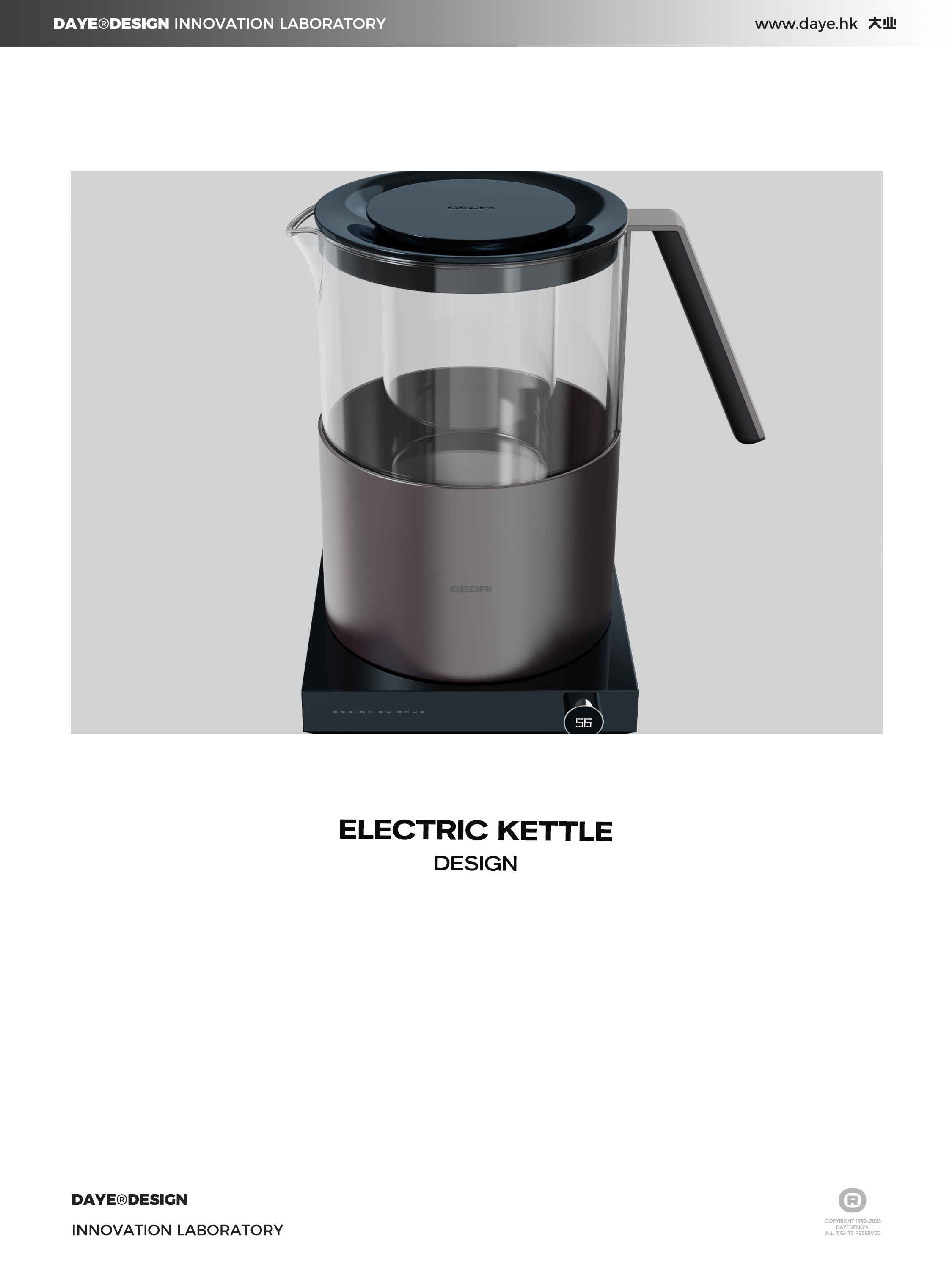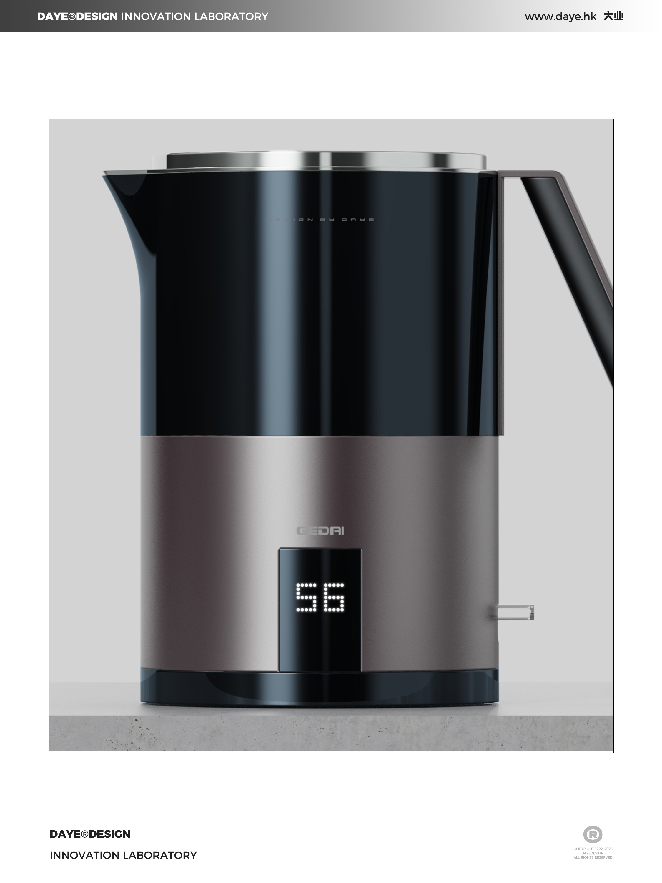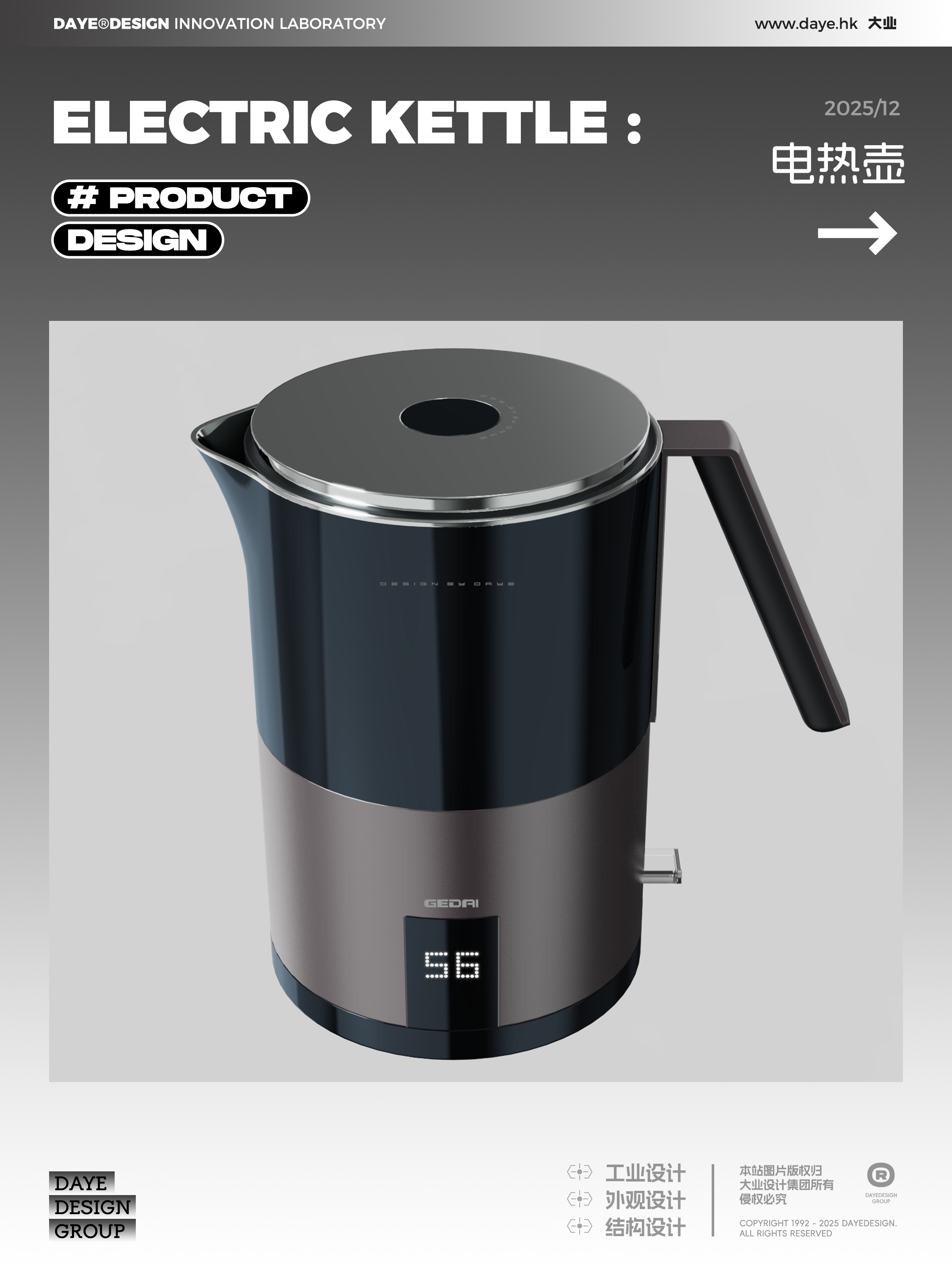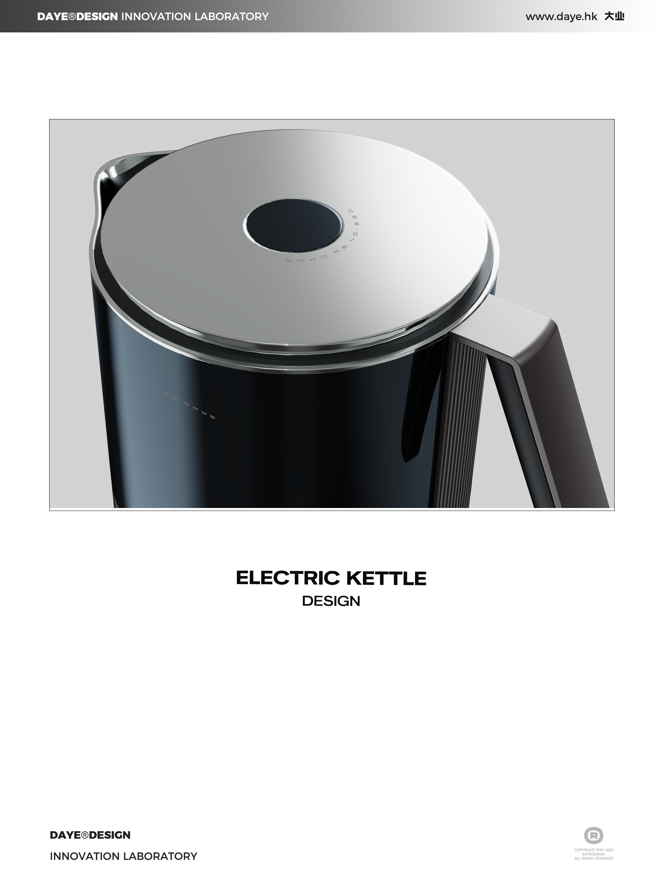 产品采用黑 + 金属灰的轻奢配色体系,传递电热壶精致、高端的家居属性,适配现代简约、轻奢风厨房空间;金属银饰条作为视觉过渡,既划分出壶身的功能模块,又以冷调金属质感强化科技感,让小家电兼具实用与装饰价值。