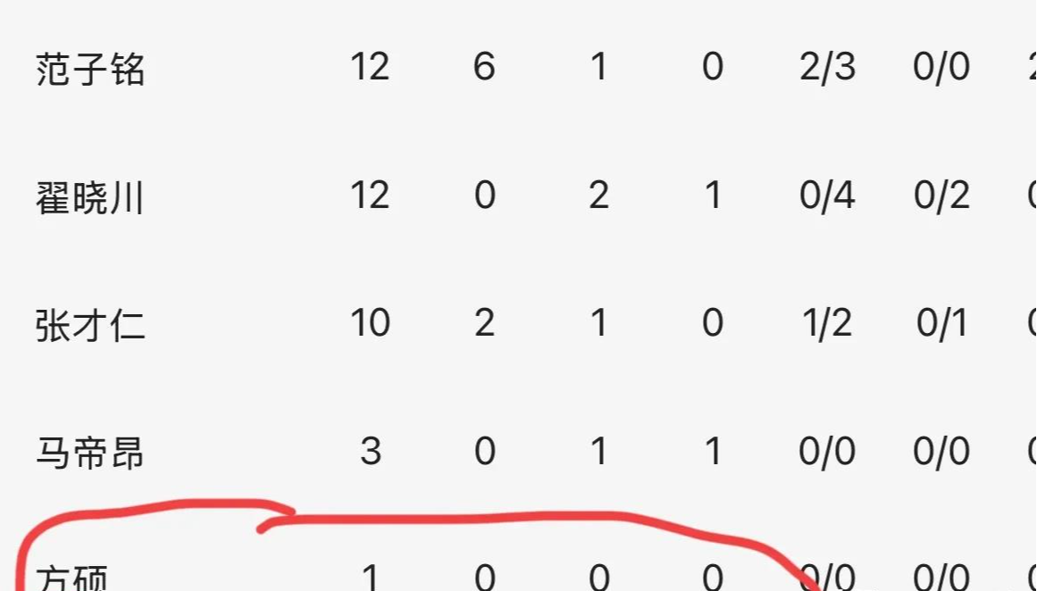 然而今天范子明的表现,只有12分钟的出场时间就拿到了6分。运动战3投两中,这表现来看还优于曾凡博。今天这场比赛,在许利民教练的排兵布阵之下,12名球员悉数登场。只有方硕自己0分0篮板0助攻。