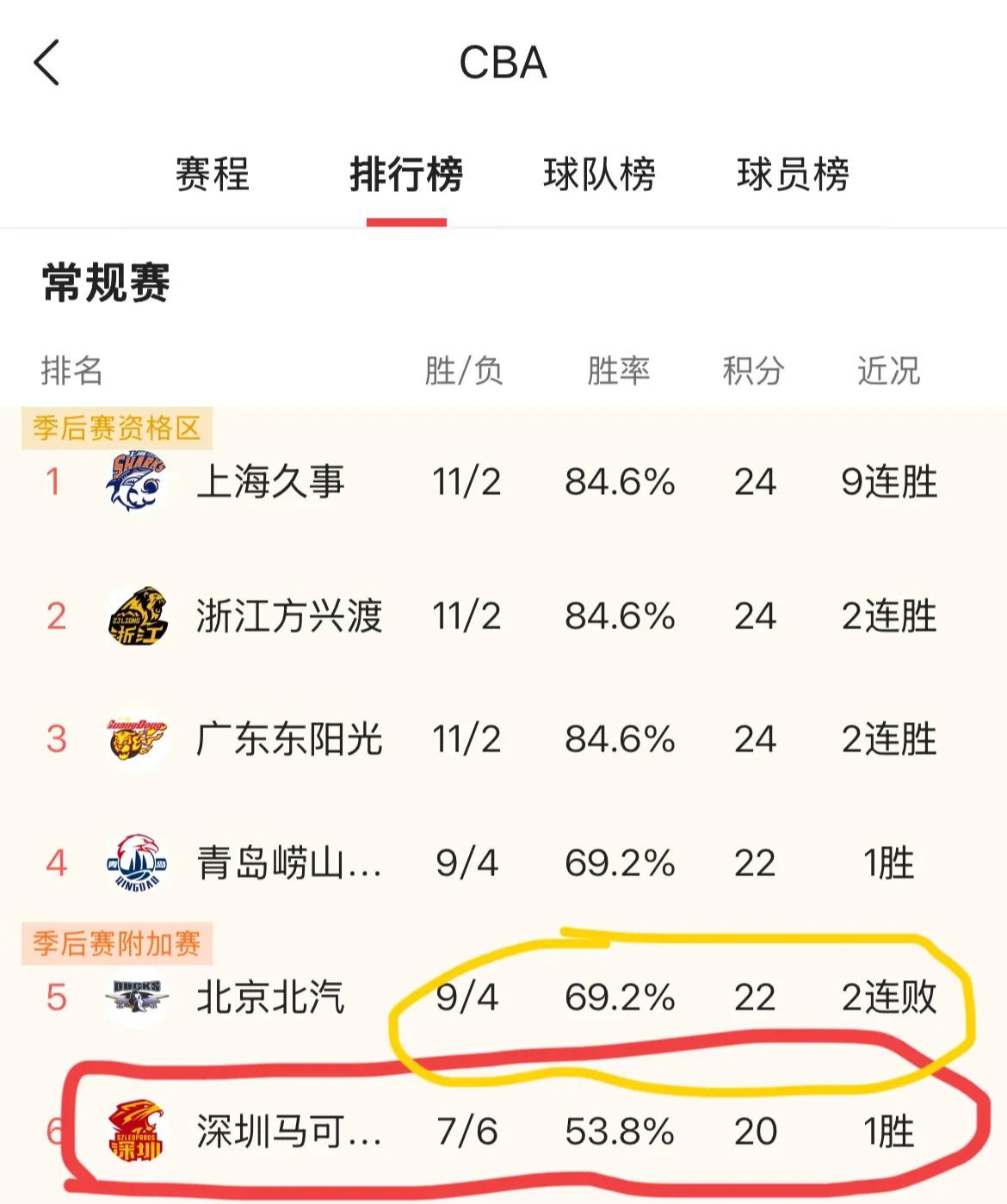 目前深圳男篮随着战胜首钢男篮继续提升排名。以7胜6负的战绩排在全联盟的第六名。而北京首钢男篮两连败,排在第五名。