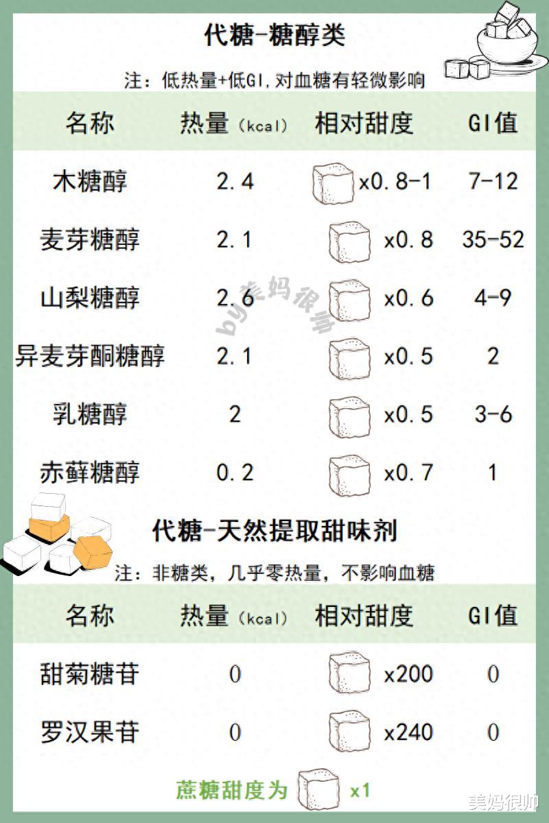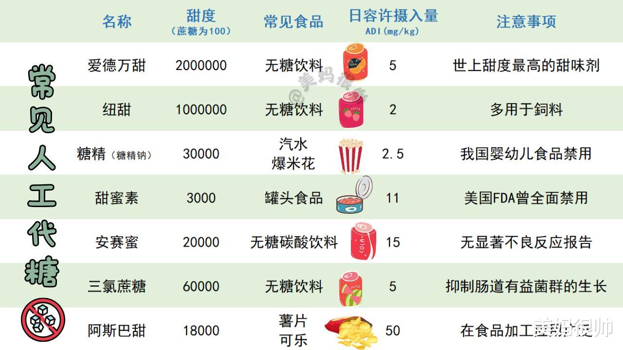因此,家长在购买时要多留一些心眼,看配料表上有没有标有下图中的代糖。