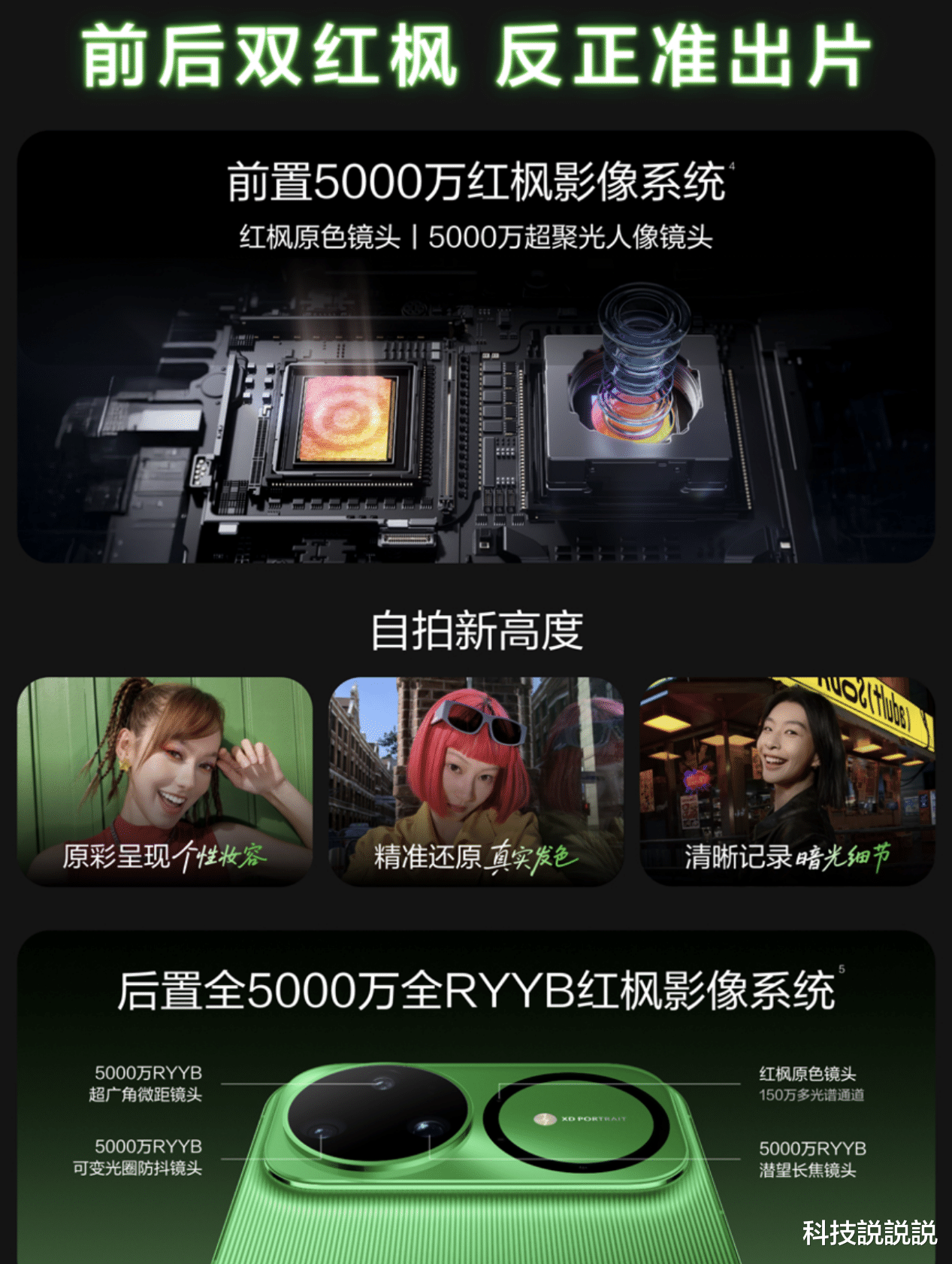这是什么概念?意味着无论你用前置自拍,还是用后置拍别人,都能享受到红枫原色镜头带来的超强感光能力和精准色彩还原。配合前后全5000万像素的高清镜头模组,以及后置的RYYB传感器,无论是夜景、人像还是日常随手拍,画面都更清晰、色彩更真实、细节更丰富。