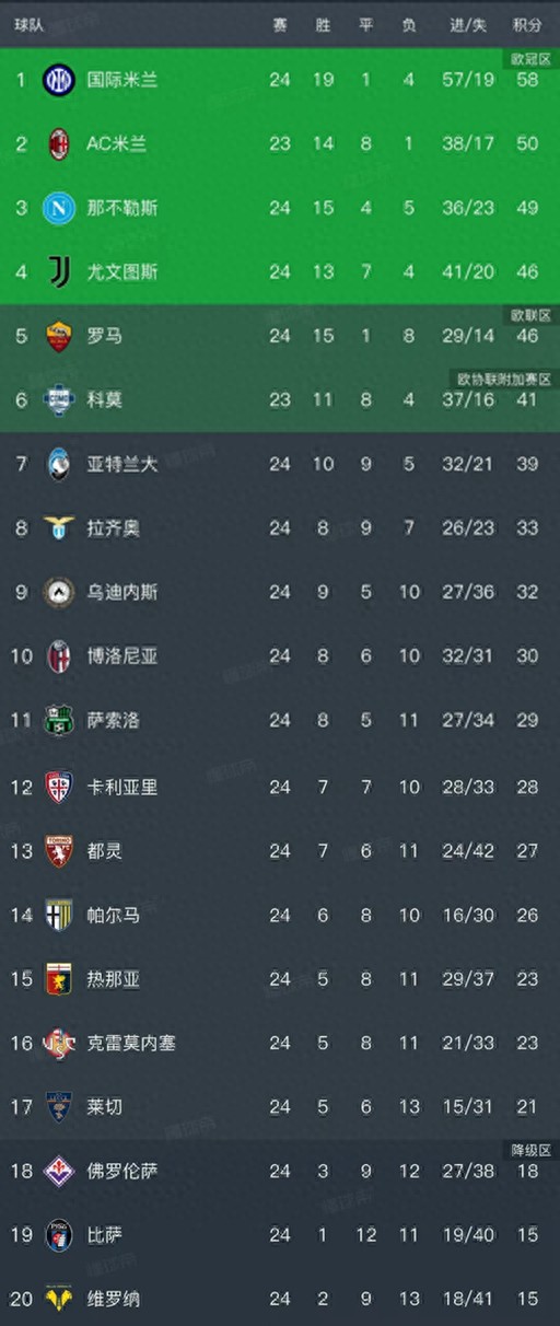 罗马本轮在主场2-0战胜了卡利亚里。亚特兰大、拉齐奥、乌迪内斯和博洛尼亚的积分在30分以上暂列第7-第10名。萨索洛、卡利亚里、都灵、帕尔马、热那亚、克雷莫内塞、莱切暂列第11-第17名。排在最后三名的是18分佛罗伦萨、15分比萨、15分维罗纳!