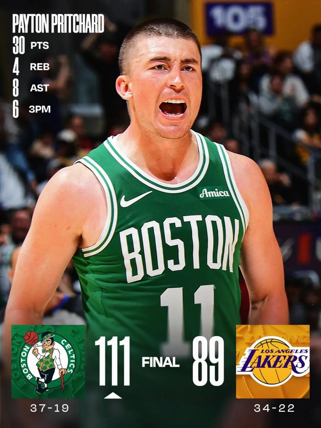 常规赛,凯尔特人客场111-89战胜湖人。