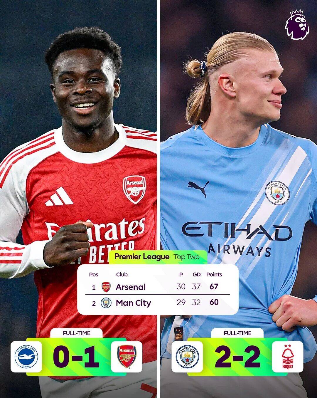 阿森纳67分领跑,曼城60分紧随其后。争冠的天平已向枪手倾斜,但3月底双方在酋长球场的直接对话仍可能改变一切。