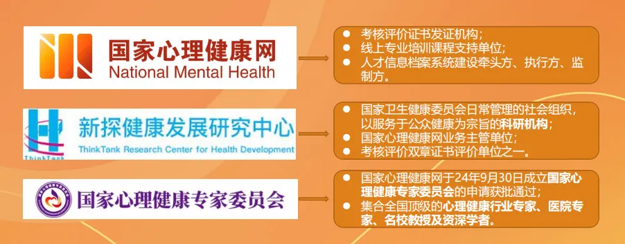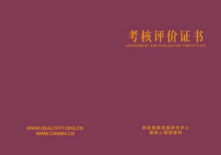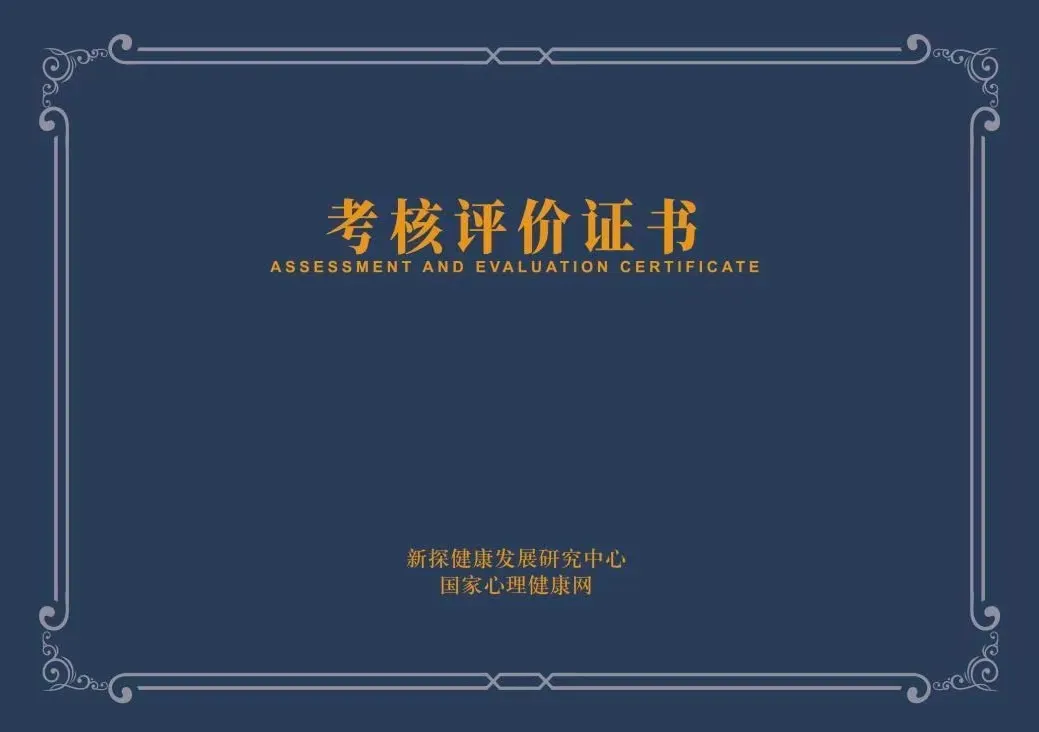 参训学员经考试合格后,由卫健委主管的“新探健康发展研究中心”与“国家心理健康网”共同颁发的心理咨询师考核评价证书(双章)。