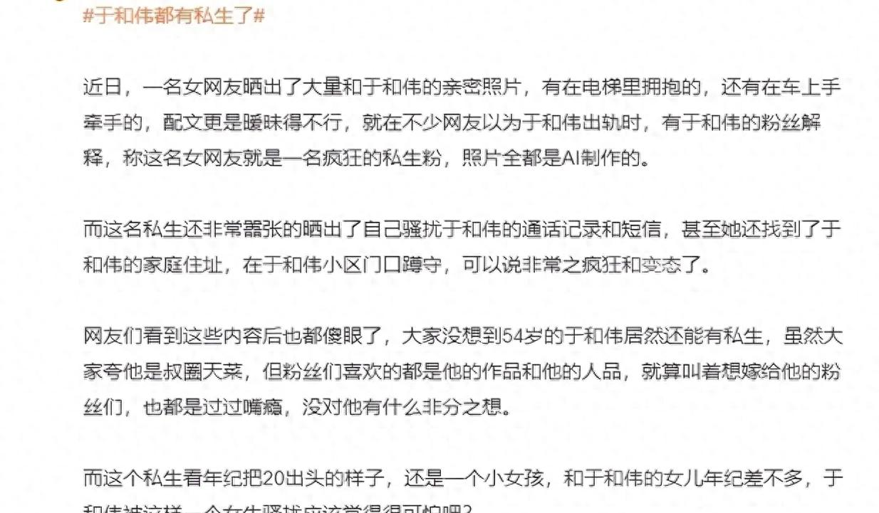 前阵子,“于和伟都有私生了”这话上了热搜,好多人吓了一跳。点开一看,根本不是那么回事。原来是私生饭在捣鬼,疯狂骚扰他好几个月。电话短信轰炸不停,换了新号码也没用,人家很快又能找上门。