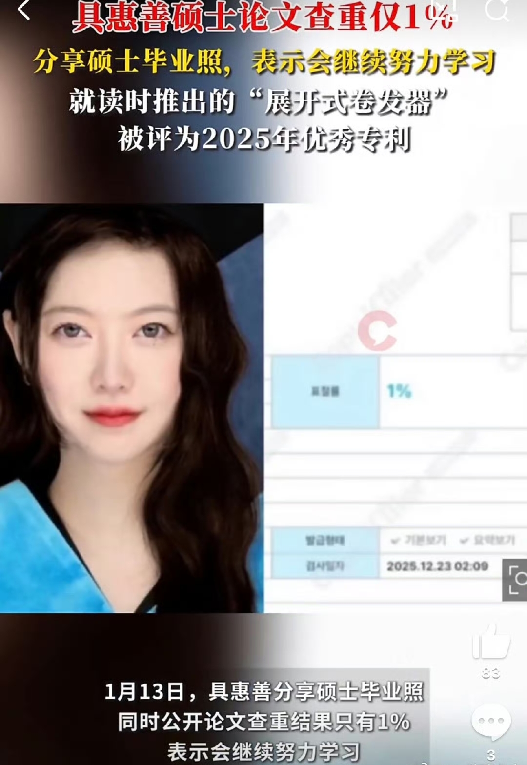 韩国知名艺人具惠善近日在社交媒体上分享了自己硕士毕业的喜悦,一张身着学位服的毕业照,搭配硕士论文查重率仅为1%的检测截图,迅速引发了大众的关注与热议。这位在大众印象中曾是“国民初恋”的女演员,用一种近乎完美的学术答卷,宣告了自己从聚光灯下的明星到严谨治学的学者的华丽转身。