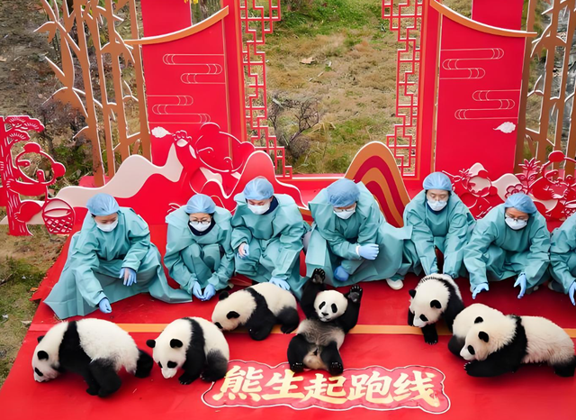 2月11日的集体亮相现场,更是萌翻全网。30只黑白团子挤在特制的竹编“春碗”里,滚来滚去,活脱脱一锅“会动的黑芝麻汤圆”,网友调侃:“这锅汤圆我吃不起,但看得起!”还有的幼崽试图爬木马列车,结果卡在中间进退两难,有的在“熊生起跑线”上四散奔逃,把摄影师逼得当场“崩溃”,场面又搞笑又治愈。