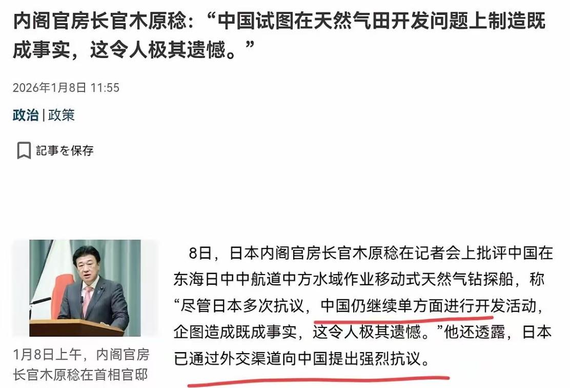 1 月 8 日,日本内阁官房长官木原稔在记者会上更是直接发难,指责中方 “持续单边开采并形成既定事实”,声称相关行为 “令人深感遗憾”。