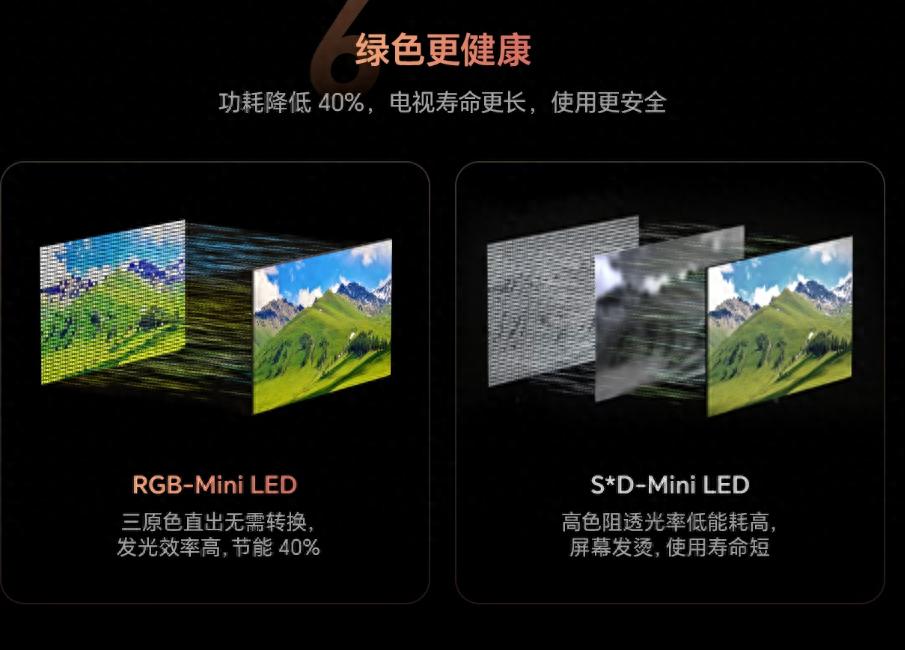 RGB-MiniLED最惊艳的技术亮点,莫过于红、绿、蓝三原色从光源处直接发光,无需依靠量子点材料“转手激发”,这种“直出式”光源设计,就像跳过了多余的中间环节,从根源上解决了传统技术的诸多痛点,带来了实打实的体验升级。首先在色彩表现上,RGB-MiniLED的优势堪称“碾压级”:三原色直出无需经过额外的光学转换,色彩纯度拉满,既能呈现出鲜活饱满、极具冲击力的亮色,也能还原细腻柔和、层次丰富的暗色调,更难得的是,即便在高亮度场景下,色彩依旧能保持稳定与精准,彻底告别了传统电视“高亮必发白、鲜艳必偏色”的尴尬,让画面还原度无限贴近真实场景——观看色彩浓郁的好莱坞大片时,能感受到扑面而来的视觉张力;赏析细节满满的纪录片时,每一处纹理、每一种色调都清晰可辨,仿佛身临其境。其次,在功耗与使用寿命上,RGB-MiniLED也尽显优势:少了一层量子点光学转换过程,光源利用率大幅提升,无需额外消耗电能激发色彩,长期使用下来能省下不少电费;同时,减少光学转换也降低了光源的发热损耗,避免了持续高温对电视内部电子元器件的“损耗消耗”,设备运行更稳定,使用寿命也更长,对于打算长期使用电视、注重使用成本的家庭来说,无疑是更省心、更划算的选择。