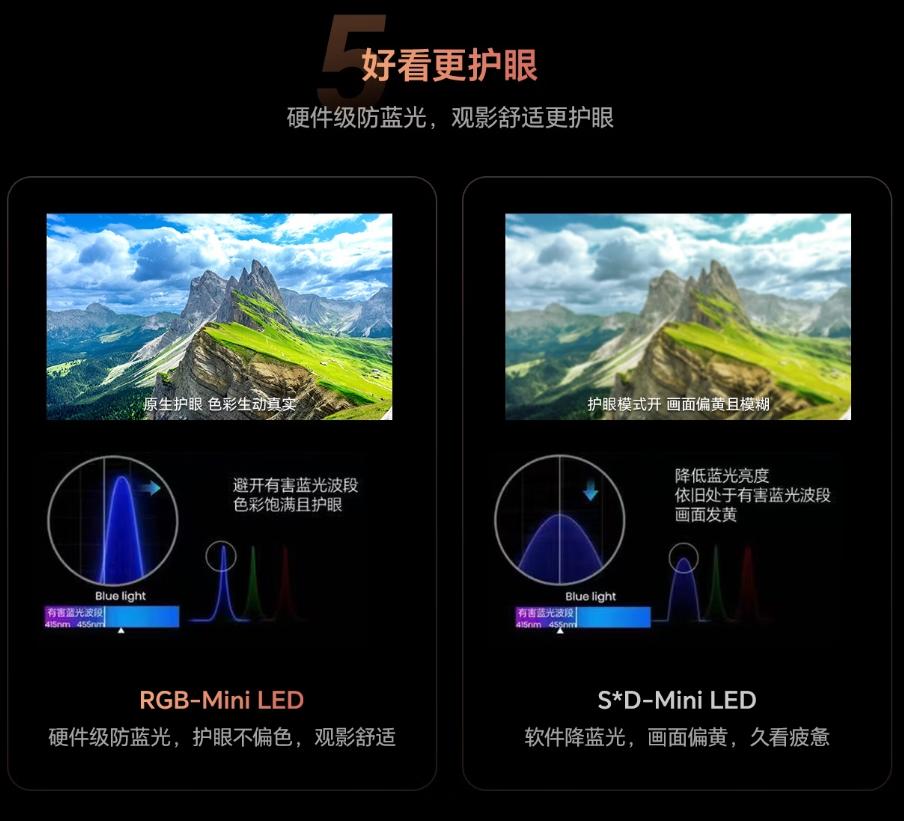 更让人眼前一亮的,是RGB-MiniLED的硬件级防蓝光技术,这也是它区别于其他显示技术的“核心杀手锏”。以海信RGB-MiniLED电视为例,其蓝色发光芯片采用可定制光谱设计,能够精准规避对人眼有害的蓝光波段,从源头切断有害蓝光的产生,真正实现“硬件级护眼”,就像给眼睛装上了一层“隐形防护盾”。这种护眼方式的最大优势,就是无需通过降低画面亮度、调整色温等“牺牲画质”的方式妥协,既能有效保护眼睛,又能完整保留画面的原汁原味,不会出现画面偏暗、色彩失真的问题。对于长期观影、经常用电视办公的上班族,或是家里有老人、孩子的家庭来说,这种硬件级防蓝光设计尤为实用,更是目前行业内最顶尖、最靠谱的防蓝光解决方案,彻底终结了“护眼必失画质”的行业痛点。