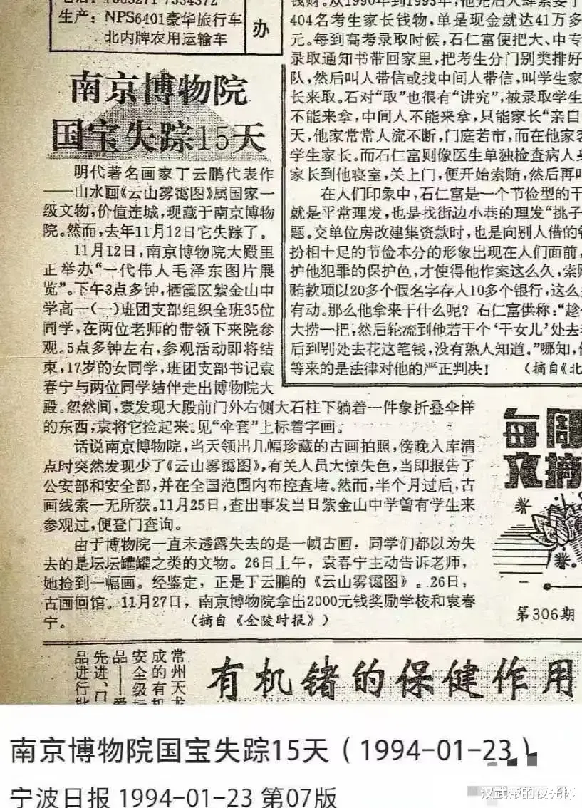就在仇英《江南春》图卷的争议愈演愈烈时,有人翻出了一张1994年1月23日的《宁波日报》。泛黄的报纸上,“南京博物院国宝失踪15天”的标题格外醒目,这则被遗忘的旧闻,揭开了南京博物院文物管理漏洞的冰山一角。